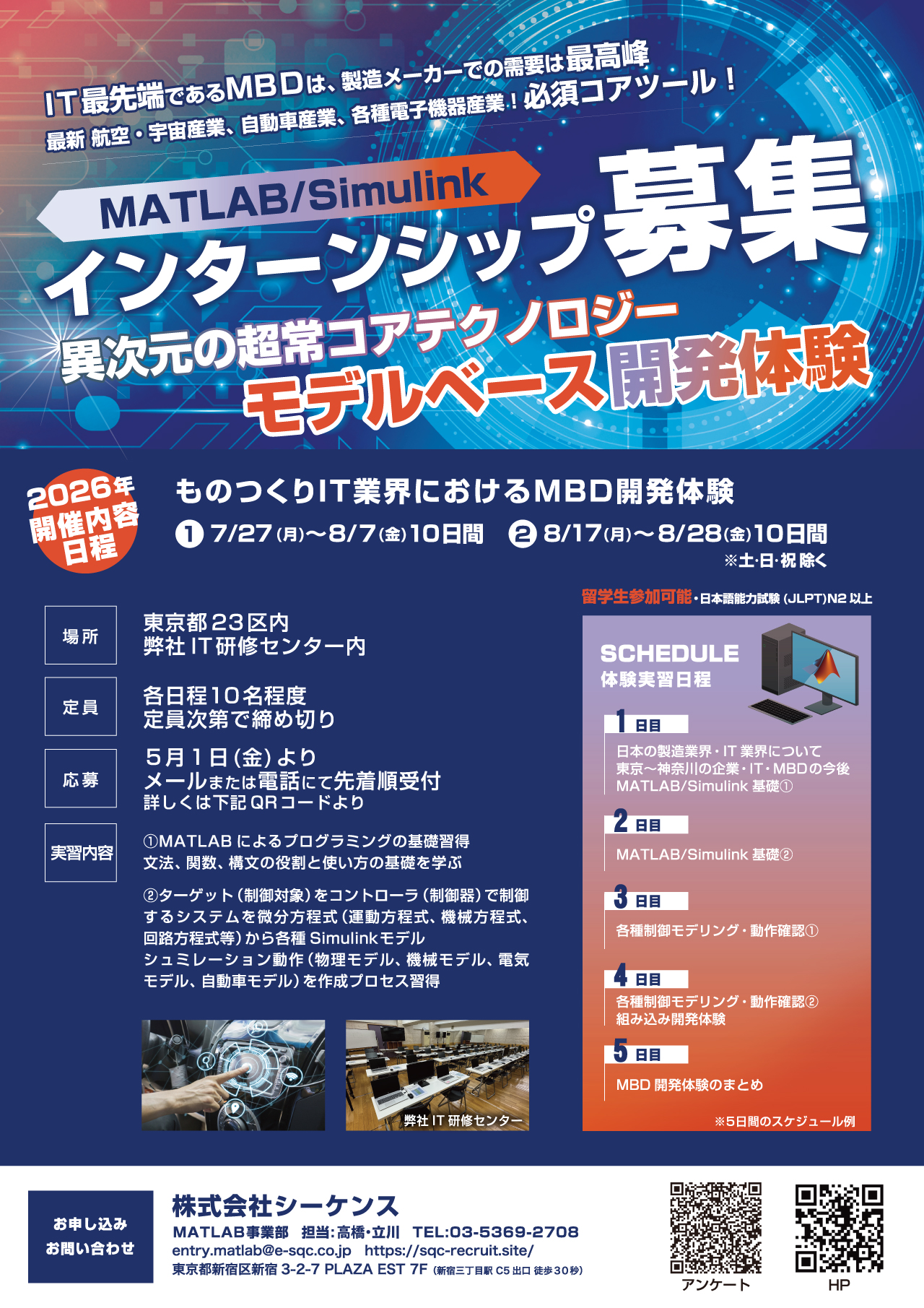 | 【応募先】 | ㈱シーケンスMBD事業部MBD(IT) 担当 高橋・立川 迄 TEL:03-5369-2708 EMail:entry.matlab@e-sqc.co.jp |